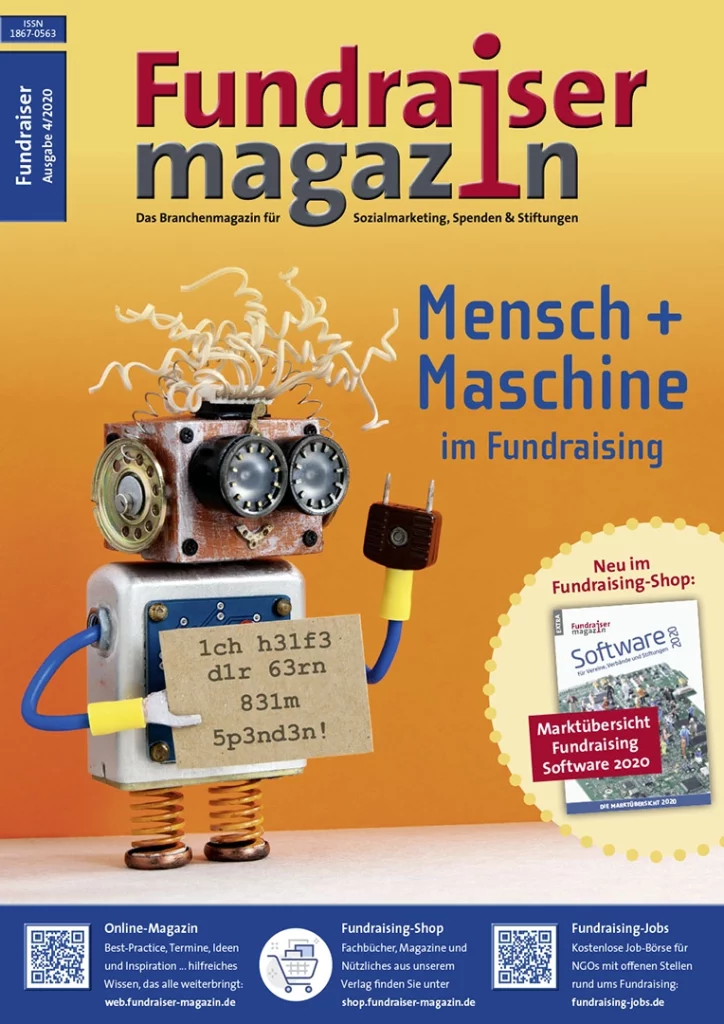Ob und wie Mensch und Maschine im Fundraising erfolgreich zusammen wirken können, ist das Schwerpunktthema dieser Ausgabe. Wie lassen sich gute Daten sinnvoll für Ihren Verein, Ihre Stiftung oder Organisation einsetzen? Außerdem: Was haben unsere Leserinnen und Leser in der Corona-Zeit gelernt? Funktioniert Fundraising ohne persönlichen Kontakt? Muss der gemeinnützige Sektor dringend digitaler werden? Das alles lesen Sie in diesem Heft. Darüber hinaus Best Practice aus Vereinen und Stiftungen – und noch viel mehr …Aus dem Inhalt
